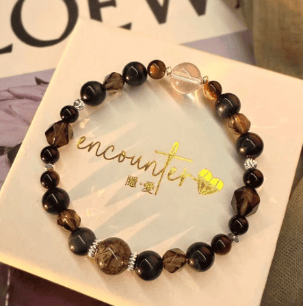 隱愛 encounter love 的藍晶手環,使用了黑髮晶、白水晶、墨藍虎眼、黃虎眼、黑瑪瑙、切面茶晶,搭配彈力線繩,它的水晶寓意能夠聚財、守護能量、增強勇氣、提升自信,對於招財以及防小人運是個多功能合一的開運小物,需注意水晶吸收負能量後會逐漸磁化,建議一個月至少消磁一次才能達到最大功效喔。